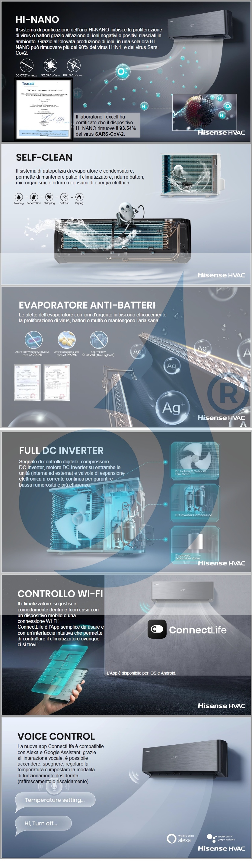 -Das HI-NANO-Luftreinigungssystem hemmt die Verbreitung von Viren und Bakterien dank der Wirkung negativer und positiver Ionen, die in die Umgebung abgegeben werden. HI-NANO wird per Fernbedienung aktiviert. HI-NANO erzeugt 1 Million Ionen pro cm3, die sich in jede Ecke des Raumes verteilen. Dank der hohen Ionenproduktion kann HI-NANO in nur einer Stunde mehr als 90 % des H1N1-Virus und des Sars-Cov2-Virus entfernen.
