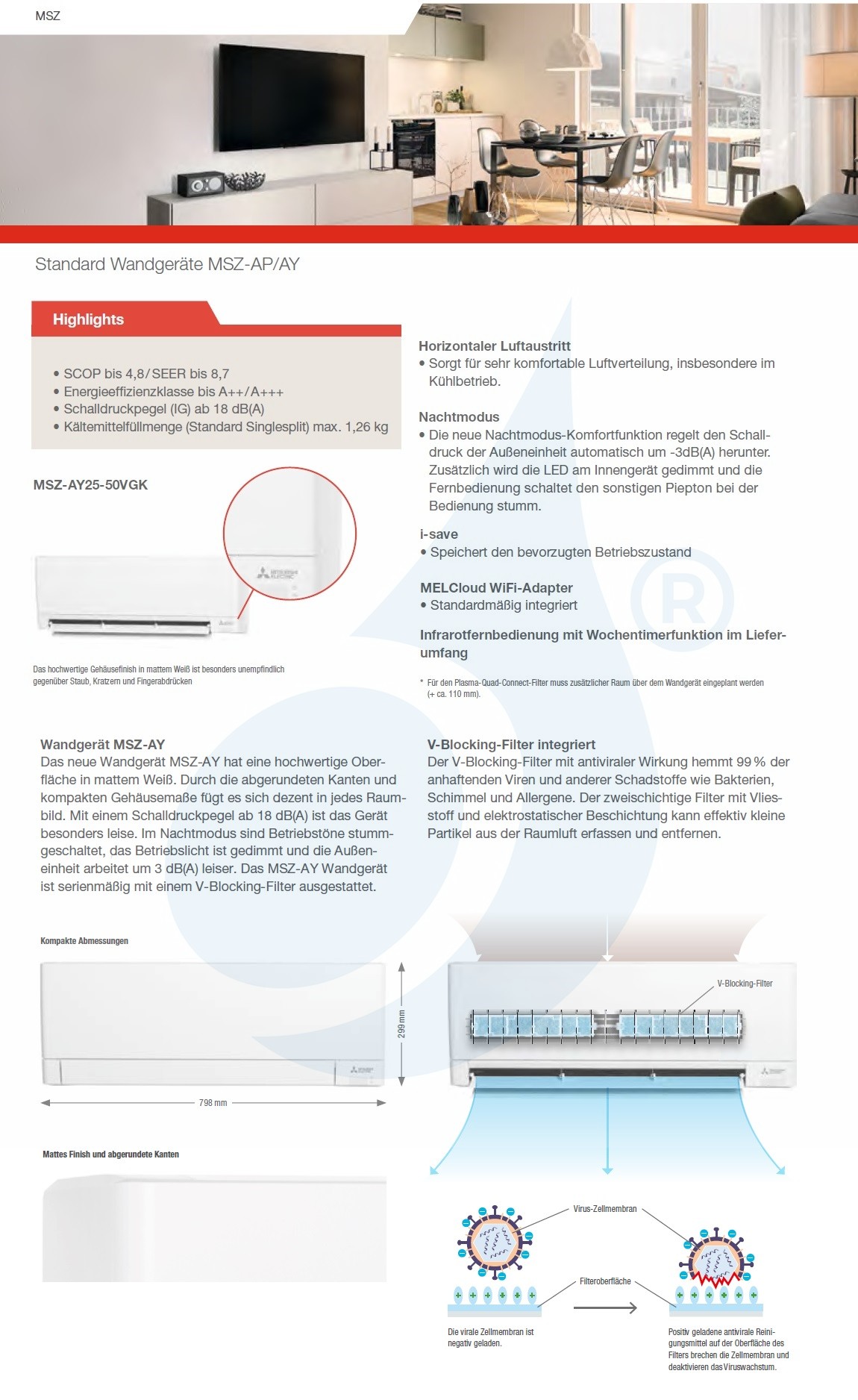 Das MSZ-AY Wandgerät istserienmäßig mit einem V-Blocking-Filter ausgestattet.