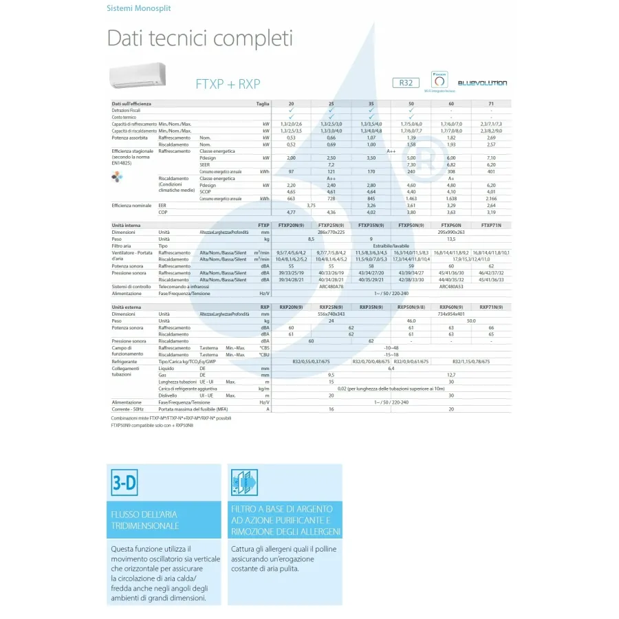 Klimaanlage Daikin Mono Split serie Comfora FTXP WiFi 9000 Btu Heizung mit Schwachstrom-Absorptionswärmepumpe in hoher Energieklasse Luftentfeuchterfunktion, Luftreinigung mit Eliminierung von Viren und Bakterien