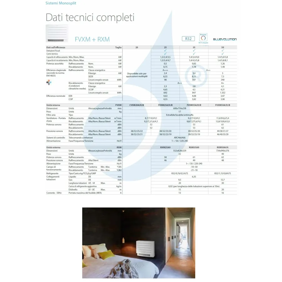 Klimaanlage Daikin Mono Split serie FVXM-B WiFi 9000 Btu Heizung mit Schwachstrom-Absorptionswärmepumpe in hoher Energieklasse ideal für Dachböden oder Installationen unter Fenstern, neue Fußbodenerwärmung und Heat Plus-Funktionen