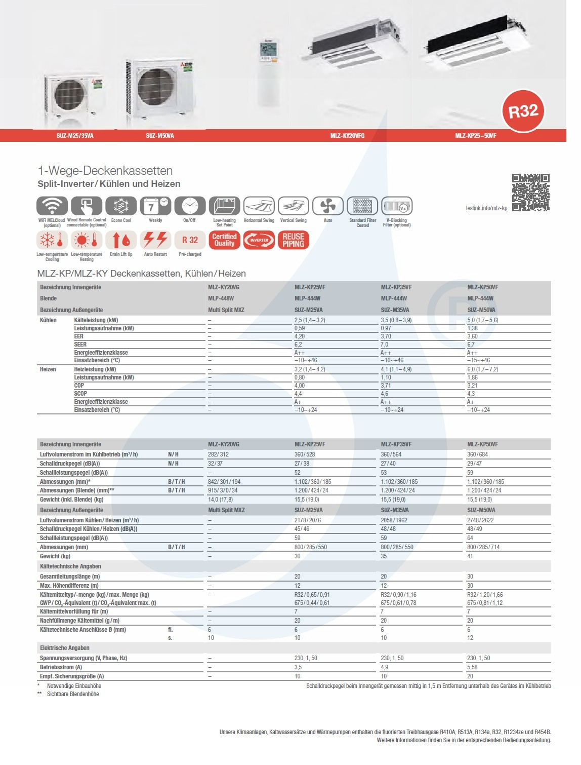 Mitsubishi Mono Split 18000 Btu MLZ-KP50VG SUZ-M50VA Klimageräte Kassettengerät 5.0 kW MLZ-KP WiFi Optional A++ A+ R-32