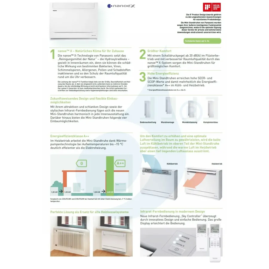 Bodenkonsole mit dem neuen Luftreinigungssystem nanoe X: Hocheffizientes A ++, Komfort (Supersilent Technology nur 20 dB (A)) bei der Kühlung und gesunde Luft in Verbindung mit modernstem Design.Der doppelte klimatisierte Luftauslass (nach oben für kalte Luft und nach unten für heiße Luft) verbessert den Komfort und macht die Umgebungstemperatur gleichmäßiger.