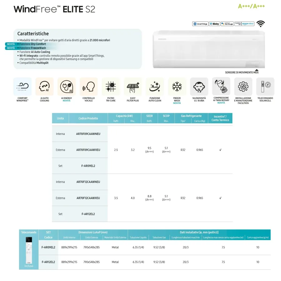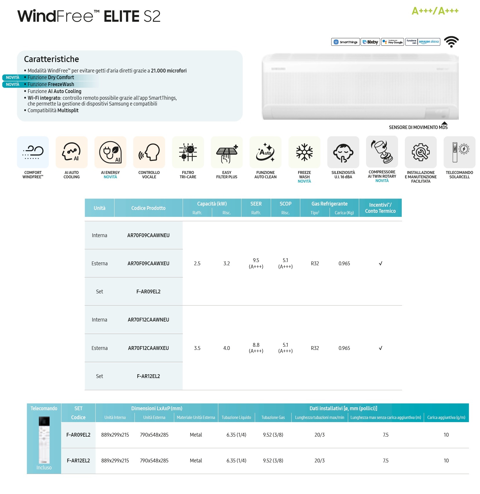Samsung Mono Split Windfree Elite S2 12000 Btu AR70F12CAAWNEU AR70F12CAAWXEU Klimaanlagen Weiß WiFi 3.5 kW R-32