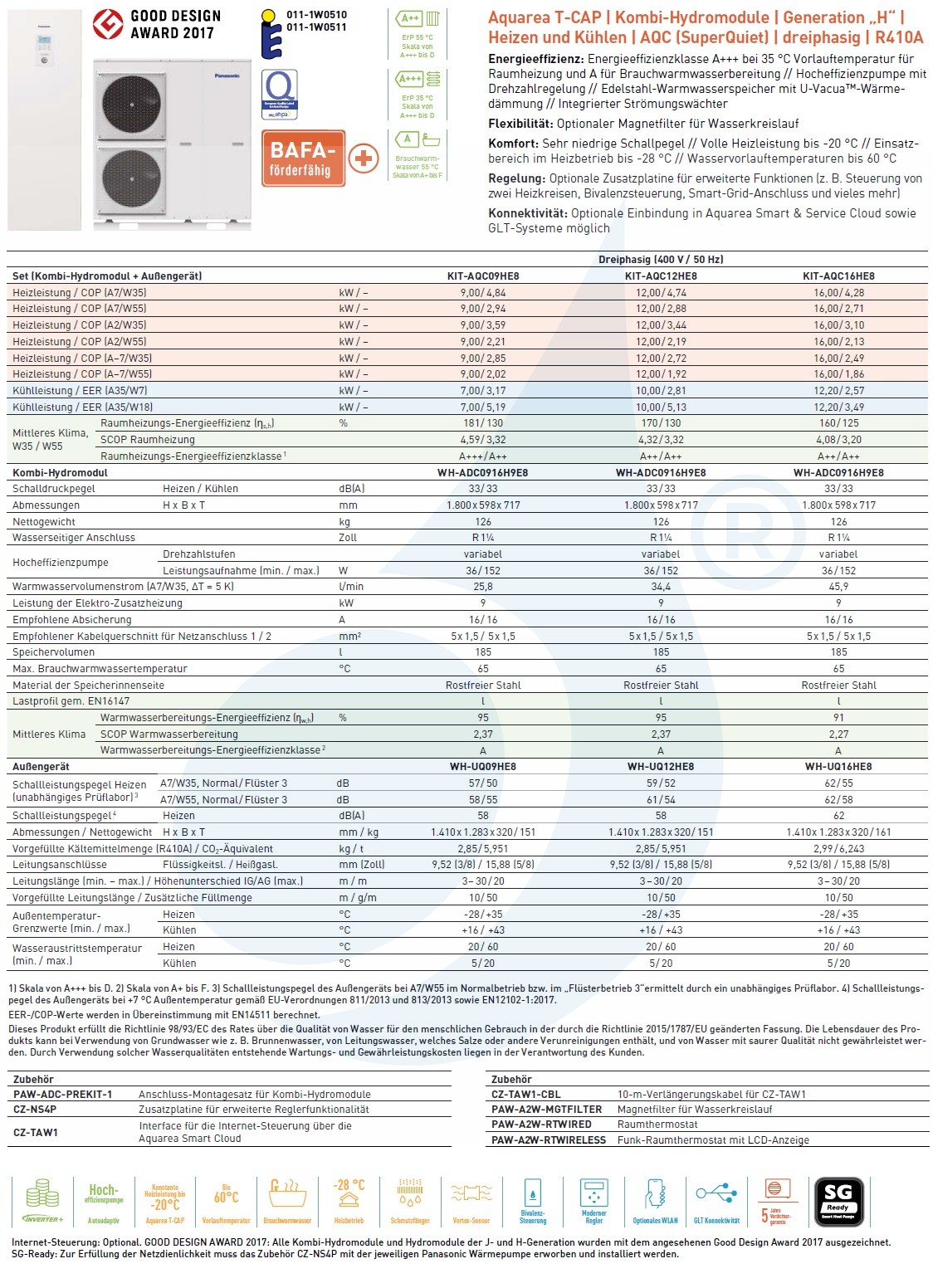 Panasonic Aquarea T-CAP Wärmepumpe KIT-AQC12HE8 12 kW 400 v R410-a SuperQuiet Kombi-Hydromodul Generation H dreiphasig